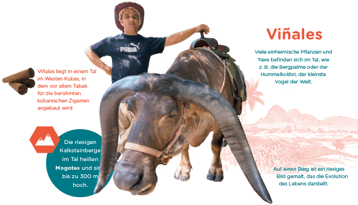 Unsere Rundreise führt uns weiter zum kleinen Ort Viñales. Schroffe, dicht bewachsene Kalksteinhügel erheben sich rund herum aus der Ebene. Ochsenkarren sind hier ein alltäglicher Anblick auf den Feldern, denn vieles wird noch in Handarbeit erledigt. Die beeindruckende Landschaft könnt ihr nach Lust und Laune zu Fuß, mit dem Fahrrad oder auch hoch zu Ross durchstreifen. Aber auch spannende Höhlen gibt es hier zu entdecken: Die Cueva del Indio ist eine Höhle, durch die sich ein kleiner Fluss zieht und die in früheren Zeiten von Indianern als Zufluchtsstätte genutzt wurde. Wer mag, kann bei einem fakultativen Ausflug die verwunschene Höhle zu Fuß und per Boot erkunden.