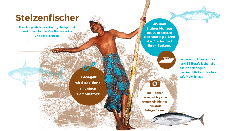 Stelzenfischer, AhangamaVom Udawalawe Nationalpark geht es hinab an die Südküste Sri Lankas. Dort warten entspannte Tage am Strand auf uns. Typisch für die Südküste sind die Stelzenfischer, die heute noch auf traditionelle Weise auf Stelzen in der Brandung sitzend ihre Fische angeln. Unser Hotel in Ahangama liegt direkt am Meer. Die palmengesäumten weißen Sandstrände bieten Möglichkeiten in Hülle und Fülle zum Baden und zum Wassersport. Wer möchte, kann von hier auch mit dem Tuk-Tuk einen Ausflug zu benachbarten Stränden oder sogar bis nach Galle machen. Innerhalb der Festungsmauern befindet sich die Altstadt, die zu einem Bummel einlädt.