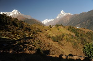 Speziell am dritten Tag des Festes leuchten dann überall an den Häusern und auf den Wegen kleine Öllampen und Kerzen.  Der dritte Feiertag ist der Kuh gewidmet. Kühe stehen symbolisch für Wohlstand und Reichtum. Kindergruppen ziehen umher, sing-sprechen kurze Lieder oder führen liebevoll einstudierte Tänze auf. Dafür erhalten sie von den Bewohnern Süßigkeiten oder etwas Geld. Vor den Hauseingängen werden mit bunten Farbpulvern schöne Mandalas auf den Boden gestreut und auch Kerzen angezündet. Damit soll Lakshmi, die Göttin des Wohlstandes, ins Haus „geführt“ werden. Die Straßen sind voller Freude und Gelärme. Und der Autoverkehr scheint noch heftiger als sonst zu sein. Alles ist durchtränkt von einer quirligen und gleichzeitig liebevollen Atmosphäre.Nepal Trekking Bergpanorama_FOC_SabineEisenmenger