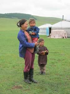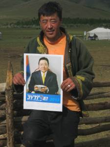 Wir sind zu Besuch bei einer Familie in der nördlichen Provinz Bulgan. Im Hunnental ist das Gras saftig und grün, die Nomaden befinden sich in ihrem Sommerlager. Die kleinen Kinder haben uns sofort entdeckt und schauen uns neugierig an. Die Familie ist anfangs zurückhaltend, taut aber schnell auf und bittet die Reisegruppe zu sich in die Jurten. Der Sohn hält ein Plakat mit dem amtierenden Präsidenten Tsachiagiin Elbegdorj von der demokratischen Partei hoch. Ihn will er am 26. Juni wiederwählen. Dazu wird die Familie in die nächste Kreisstadt fahren, wo sie registriert ist.