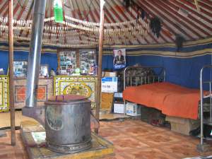 Das Innenleben einer Jurte: Herzstück ist der große Holzofen, an den Wänden hängen die Quarkstücke zum trocknen (Aruul auf mongolisch).