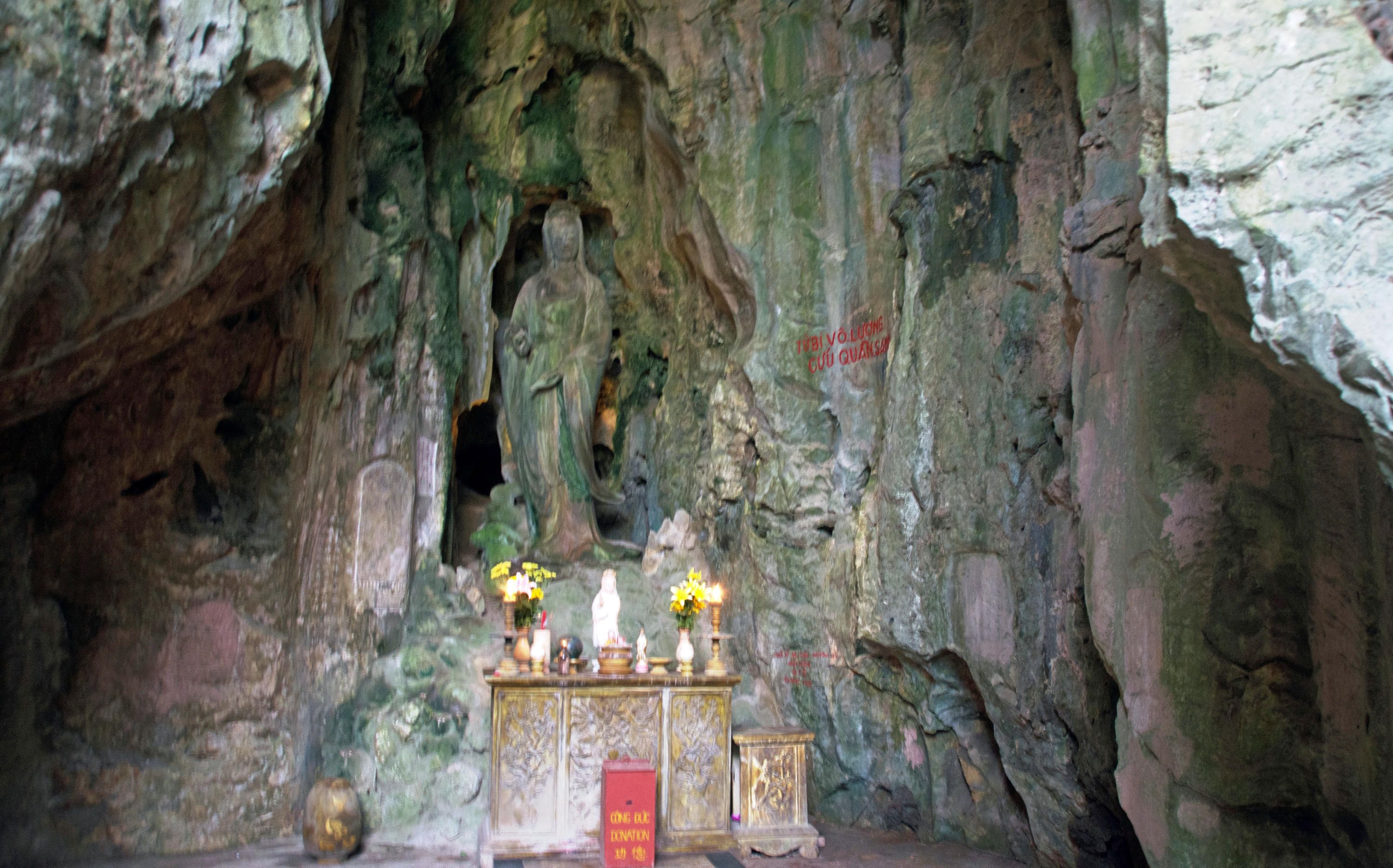 Obwohl ich nicht gläubig war, ging ich doch weiter die Marmortreppen zum Gipfel des Berges hinauf, bemüht, den Anschluss zum alten Mütterchen nicht zu verlieren. Dann kamen wir zur größten Höhle. Am Eingang stand eine Madonna. Doch meine Führerin klärte mich auf, dass dies Quan Am sei, die Boddhisattva des Mitgefühls. Sie versorgte ein Baby von einer anderen Frau indem sie betteln ging. Das Kind überlebte, doch sie verhungerte. So jedenfalls eine der Legenden um Quan Am. In mir rührte sich etwas und ich verneigte mich sehr gerne vor ihr - mit Räucherstäbchen in der Hand. Seither ist sie meine Lieblings-Boddhisattva.