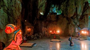 Gehorsam brannte ich drei Räucherstäbchen an und steckte sie in den dazu vorgesehenen Behälter. Ich sollte die Hände falten und dreimal zum Kopf führen. Dann kletterte sie hinter den Buddha und bedeutete mir, ich solle ihr folgen. Da entdeckte ich den liegenden Buddha, der recht alt zu sein schien. Langsam fand ich die Sache interessant! Dann gingen wir in die Höhle neben an. Dort stand ein Altar der Cham, einem Volk, dass wohl bereits seit dem 2. Jahrhundert hier lebt. Ihr Königreich ist allerdings im 17.Jh. untergegangen. Die alte Dame fragte mich ob ich den Geist der Höhle sehen könne. Sie war mir dann behilflich, indem sie mit ihrer Taschenlampe die Umrisse einer Schildkröte ganz hinten an der Wand nachzeichnete. Da war sie! Auch hier brannte ich drei Räucherstäbchen an und verneigte mich brav.