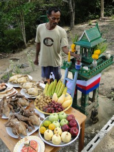 Daher wird vor allen wichtigen Anlässen, also bei Geschäftseröffnungen, Heirat, Autokauf etc. eine Opferzeremonie abgehalten. Ort dieser Zeremonie ist in der Regel ein Geisterhäuschen, über das jedes Grundstück in Thailand verfügt (denn, möchte man ein Haus bauen, muss selbstverständlich der auf dem Grundstück wohnende Erdgeist besänftigt werden und das geht nur, indem man ihm ein alternatives, standesgemäßes Domizil zur Verfügung stellt).