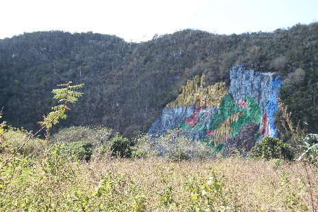 Natur im Überfluss, das ist Valle de Vinales. Wir wandern durch sattgrüne Felder. Vorbei an Bananenstauden und Maisfeldern. Das Auge erfreut sich an kleinen Häusern mit Schaukelstühlen auf den Veranden und an im Wind flatternder Wäsche. Im Tal von Vinales gedeiht der beste Tabak der Welt und auch Kaffee wird angebaut und geröstet. 25 Jahre ist es her, dass ich Tabak geschmeckt habe. Heute nehme ich mal wieder einen Zug. Und siehe da, er schmeckt. Ein weiterer Anziehungspunkt in der Region ist das Mural de la Prehistoria, ein 1961 vom mexikanischen Künstler Leovigildo González Morillo auf einem Kalkfelsen geschaffenes, 120 m hohes und 180 m breites Kunstwerk. Da sich über Geschmack bekanntlich nicht streiten lässt, lasse ich das Wort "Kunstwerk" hier einfach mal so stehen.