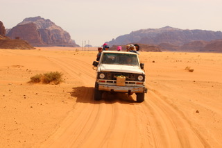 Nach Petra ging die Reise weiter in Richtung Wüste. Wadi Rum war ebenfalls einer der Höhepunkte der Reise. Vor Ort wurde man mit Jeeps in das Zeltcamp gebracht, wo man die Nacht verbrachte. Das Camp war sehr schön eingerichtet mit einem runden Essaal in einem Lehmhaus und den Zelten, welche im Kreis um das Hauptgebäude ausgestellt waren. Es wurde eine dreistündige Jeep-Tour angeboten, welche uns bis zu natürlichen Steinbrücken führte. Das Ende der Tour war zeitgleich mit dem Sonnenuntergang, der dann noch von einer Anhöhe angeschaut werden konnte. Als es immer dunkler wurde, sah man mit bloßem Auge immer mehr Sterne. Auch Sternschnuppen konnte man beobachten.